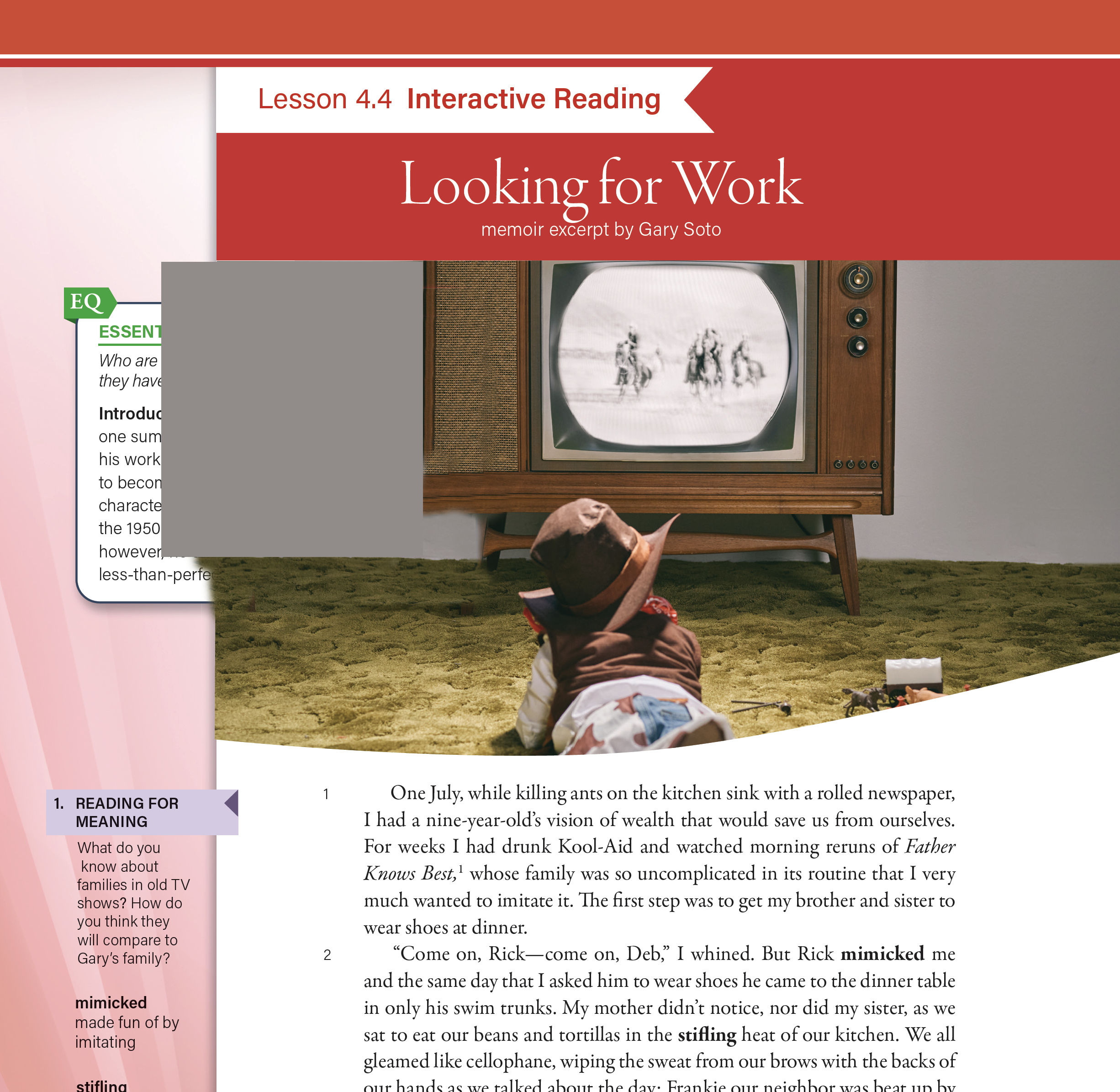 Reading for Meaning and Literary Lens skills are introduced to activate or build upon prior knowledge. Skills are color coded and reinforced throughout the reading passage.