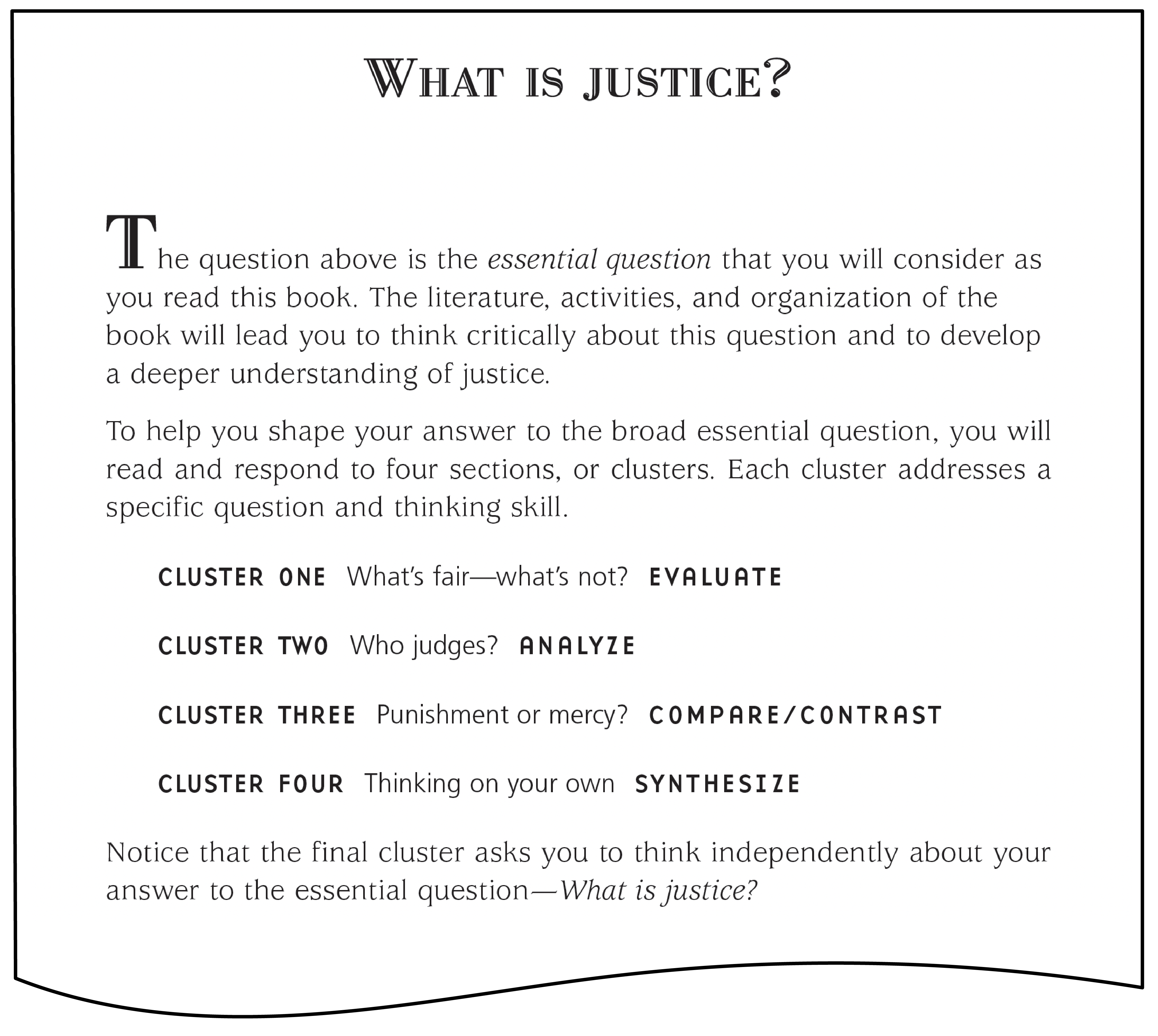 Each of the 25 anthologies has a central essential question to guide reading, writing, and discussion. Each unit within an anthology focuses on a critical thinking skill.
