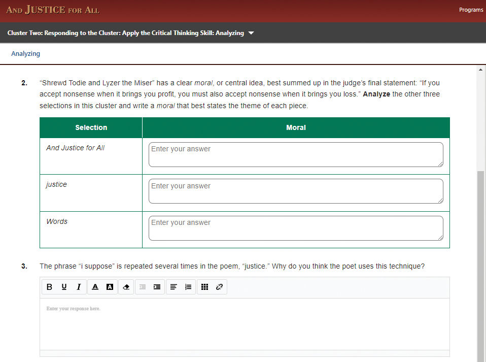 • Interactive minilessons for critical thinking skills, reading skills/strategies, and textual analysis.